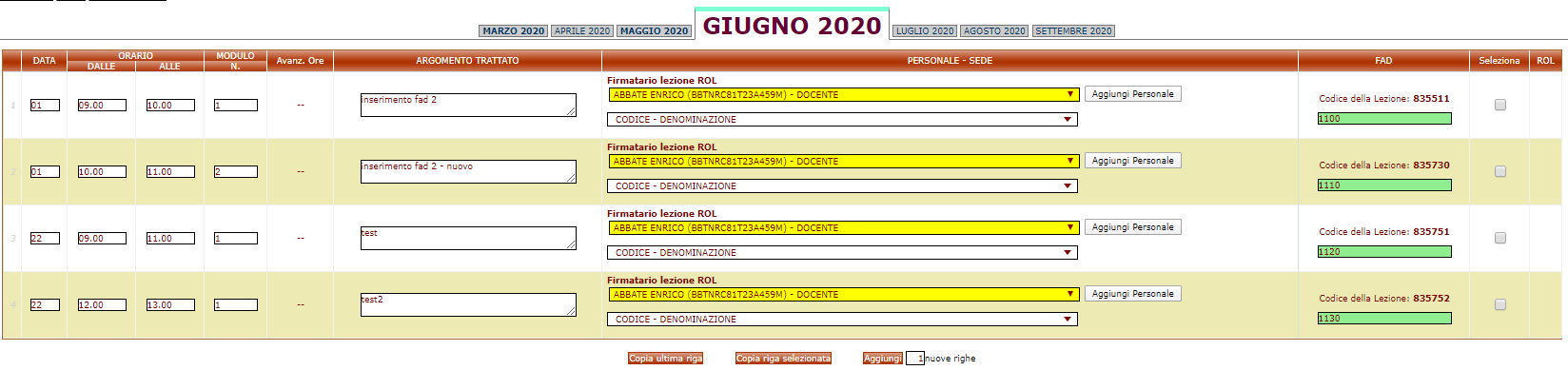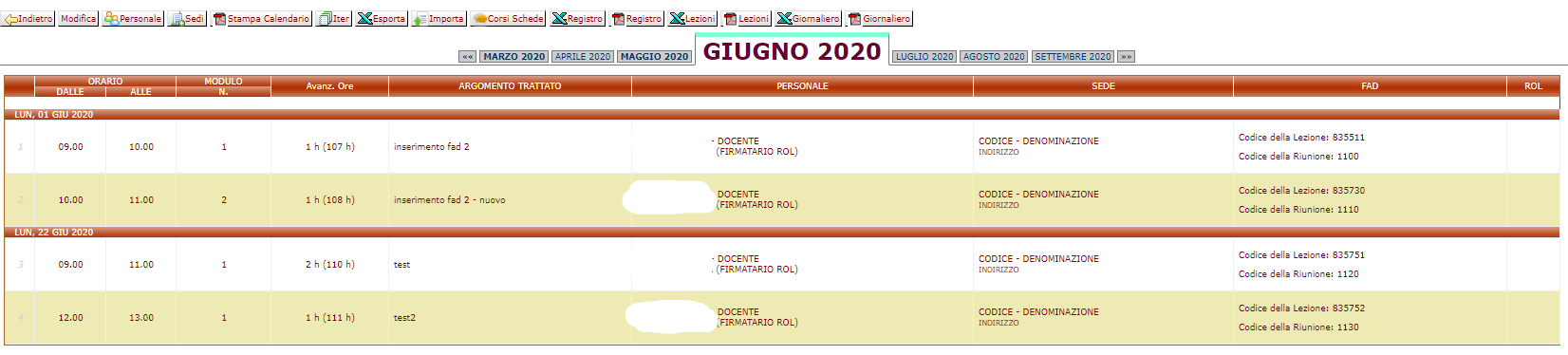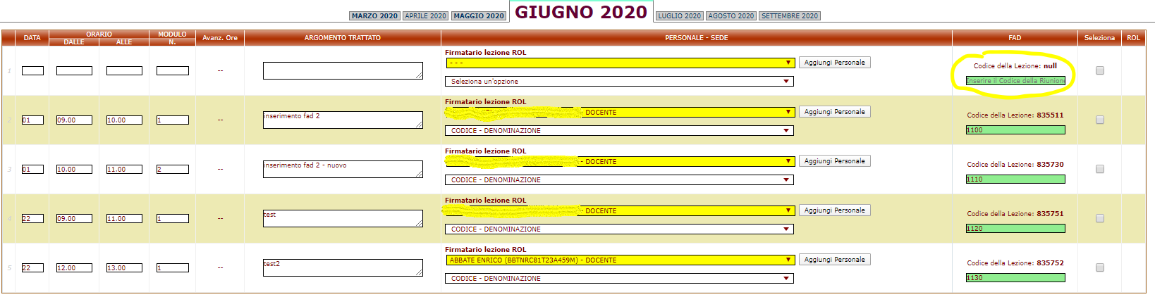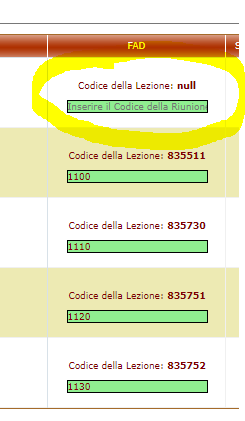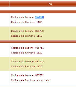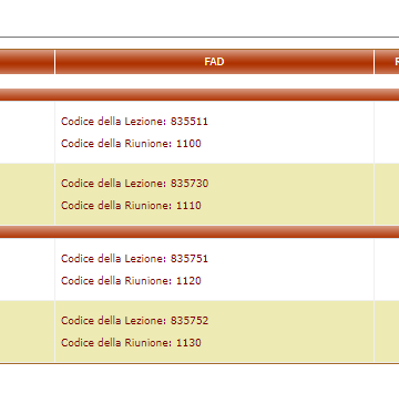 E' stata creata a destra una colonna "FAD" nella quale sono esposti due codici all'interno di ciascuna lezione:
