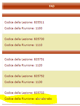 Il Codice della Riunione sarà visualizzato nella scheda della lezione in ROL, in maniera che il docente possa controllare la corrispondenza del codice tra la piattaforma per la FAD e ROL.