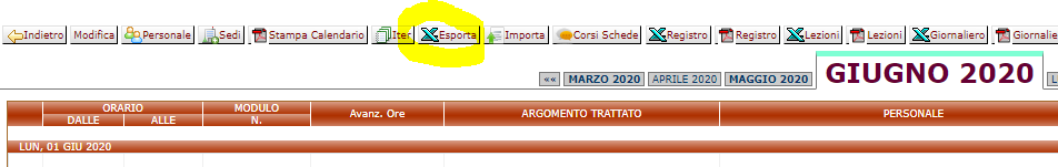 Per tenere traccia della relazione Codice della Lezione + Codice della Riunione, anche ai fini del caricamento del codice nel file di interscambio, si utilizza la funzione "Esporta":