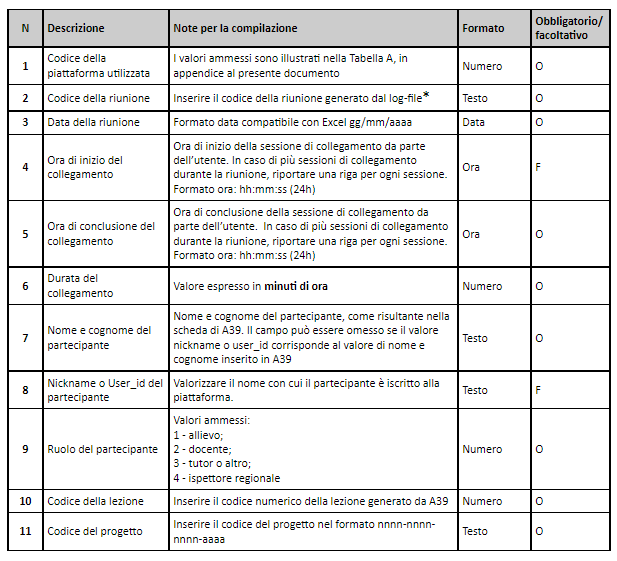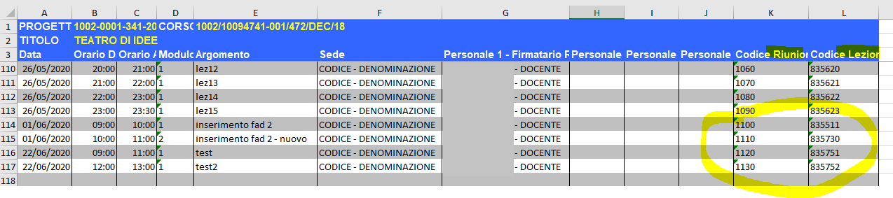 Gli enti che utilizzano la funzione per il caricamento massivo delle lezioni dovranno scaricare una nuova copia del file del calendario nella quale troveranno le colonne Codice Riunione e Codice Lezioni e compileranno la colonna Codice Riunione prima di effettuare l'upload in A39.