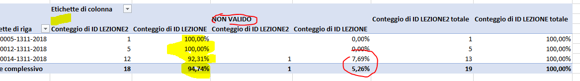 - ID LEZIONE (conteggio, impostare Mostra valori come: “% del totale riga”)