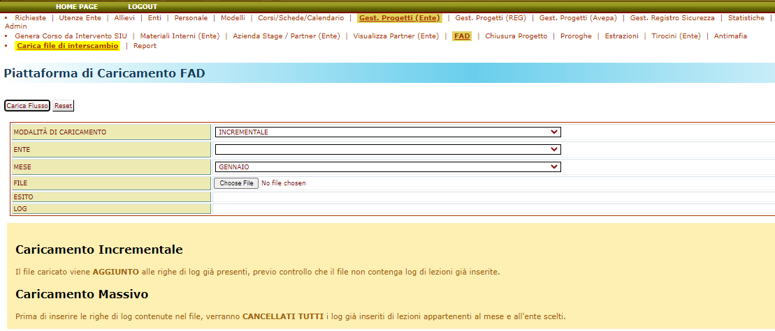 - MASSIVO: con il caricamento del file vengono cancellate tutte le righe già caricate e relative alle lezioni appartenenti all'ente e al mese selezionati.