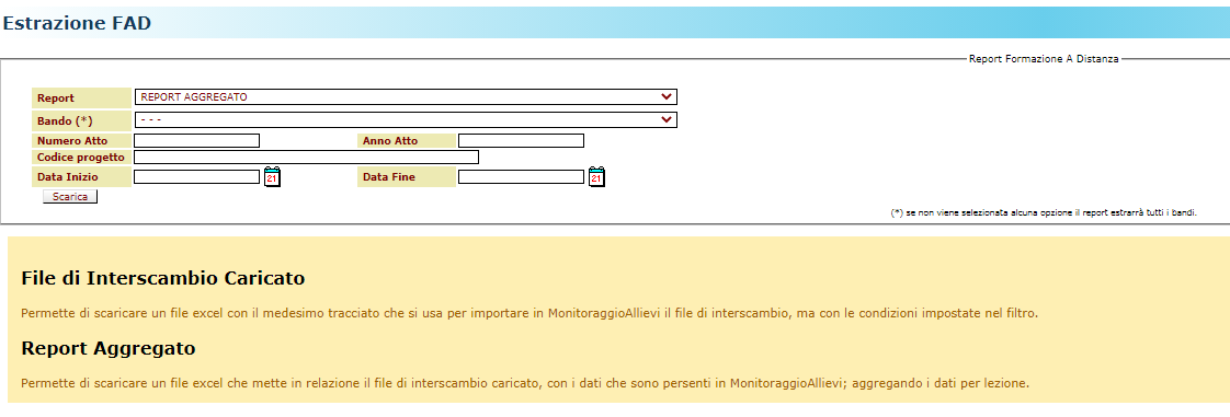 La funzione di verifica della qualità dei dati caricati attraverso la piattaforma di interscambio è disponibile nel menù "Estrazioni" --> "FAD", con la seguente maschera, dalla quale è possibile selezionare due tipologie di report: